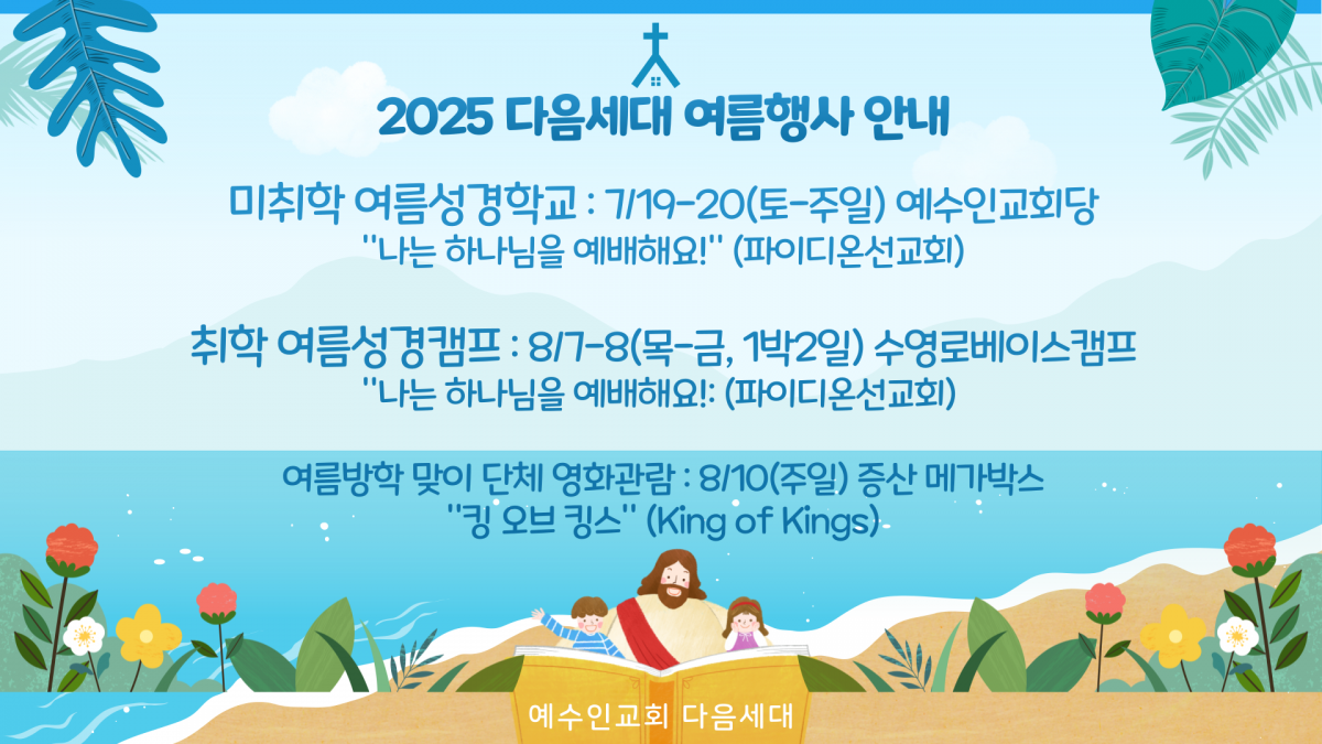 2025 다음세대 여름 행사 안내 페이지 정보 작성자 신동조 작성일25-07-15 11:00 조회94회 댓글0건 관련링크 이전글 다음글 목록 본문 2025 다음세대 여름 행사 안내 댓글목록 등록된 댓글이 없습니다. 이전글 다음글 목록