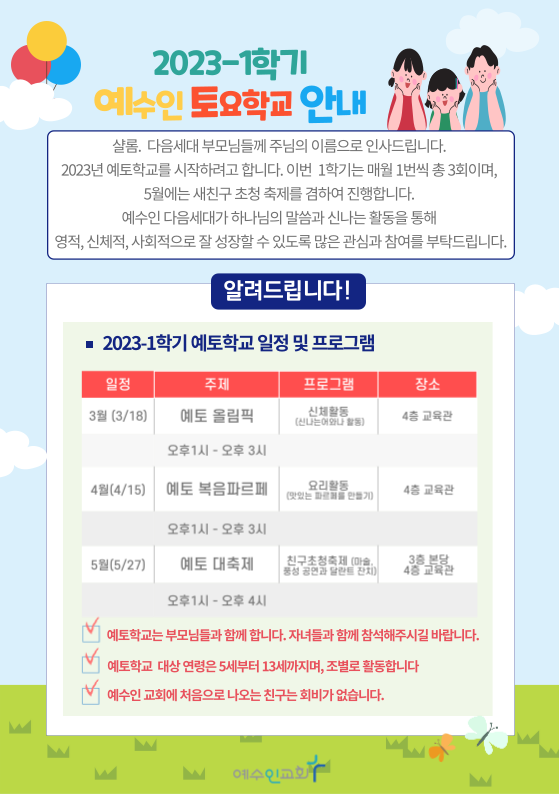 예토학교 2023-1학기 예토학교 안내드립니다! 페이지 정보 신동조 작성일 23.03.07 187회 본문 예토학교 안에서 하나님의 말씀과 신나는 활동을 통해 예수님 안에서 영적, 신체적으로 성장하는 예수인 다음세대가 될 수 있도록 많은 관심과 기도 부탁드려요.^^ 목록