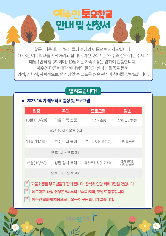 예토학교 2023-2학기 예토학교 안내드립니다! 페이지 정보 신동조 작성일 23.10.14 180회 본문 예토학교 안에서 하나님의 말씀과 신나는 활동을 통해 예수님 안에서 영적, 신체적으로 성장하는 예수인 다음세대가 될 수 있도록 많은 관심과 기도 부탁드려요.^^ 목록