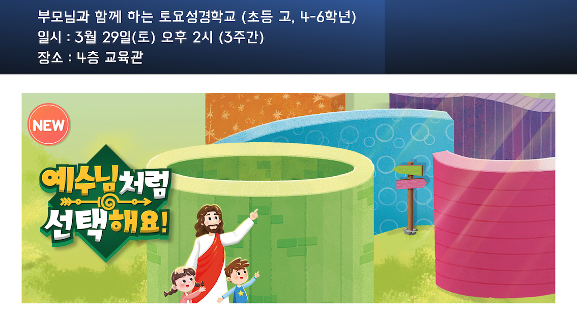 "예수님처럼 선택해요!"라는 주제로 3월 29일부터 3주간 초등고학년 토요성경학교를 진행하고자 합니다.