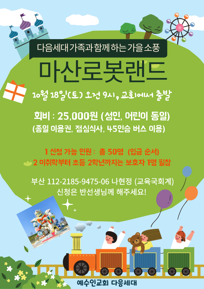 예토학교 2025 다음세대 가을소풍 (마산 로봇랜드) 페이지 정보 신동조 작성일 25.10.13 89회 본문 2025 다음세대 가을소풍 일시 : 10월 18일(토) 오전 9시장소 : 마산 로봇랜드 목록