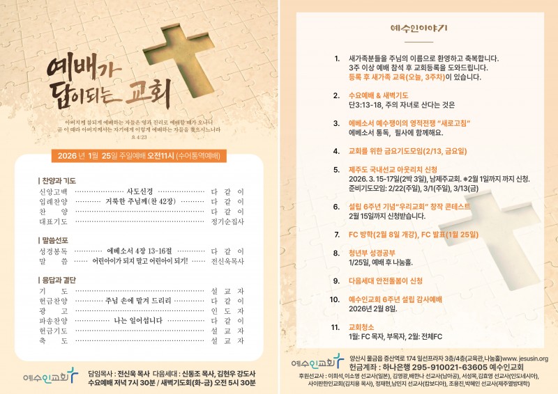 26. 1. 25 주보 페이지 정보 작성자 예수인교회 작성일26-01-24 14:23 조회37회 댓글0건 관련링크 이전글 다음글 목록 본문 1월 마지막 주일 교회 소식지입니다* 이반주일엔 FC(Family Church 소그룹) 편성 발표가 있습니다♡ 댓글목록 등록된 댓글이 없습니다. 이전글 다음글 목록
