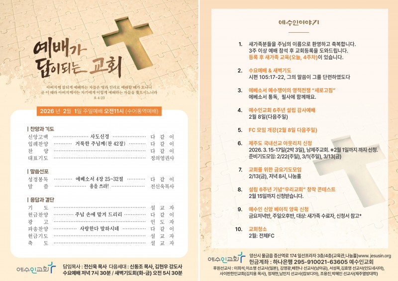 26. 2. 1. 주보 페이지 정보 작성자 예수인교회 작성일26-01-31 13:25 조회34회 댓글0건 관련링크 이전글 다음글 목록 본문 2월 첫째 주일 교회 소식지입니다. 다음 주일은 예수인교회 서립 6주년 감사예배로 드려집니다. 댓글목록 등록된 댓글이 없습니다. 이전글 다음글 목록