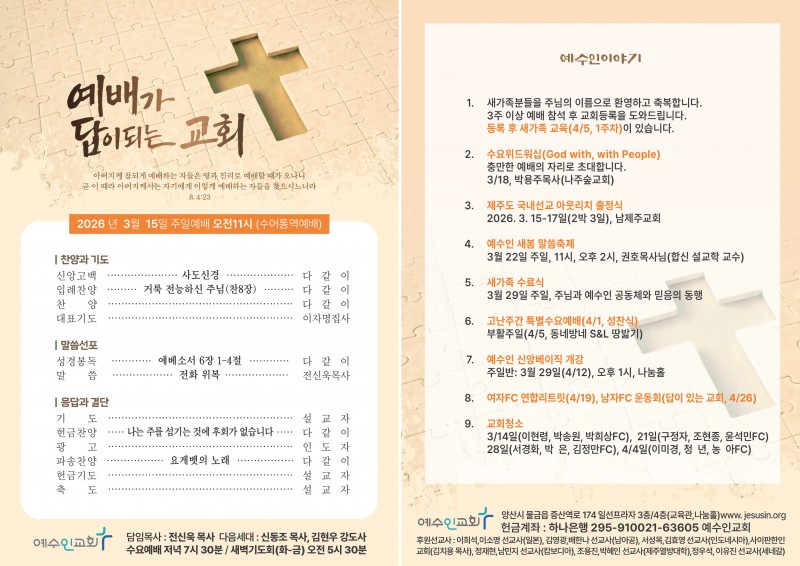 26. 3. 15 주보 페이지 정보 작성자 예수인교회 작성일26-03-14 00:23 조회26회 댓글0건 관련링크 이전글 다음글 목록 본문 3월 셋째주일 교회소식지입니다* 이번주일에 15일-17일까지 제주도 아웃리치 국내선교가 있습니다♡ 함께 기도해주세요* 댓글목록 등록된 댓글이 없습니다. 이전글 다음글 목록