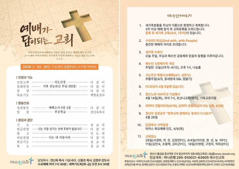 26. 03. 29. 주보 페이지 정보 작성자 예수인교회 작성일26-03-28 13:46 조회16회 댓글0건 관련링크 이전글 다음글 목록 본문 3월 마지막 주일 교회 소식지입니다. 이번 주일에는 새가족 수료식과 주일 베이직 양육반이 개강합니다. 댓글목록 등록된 댓글이 없습니다. 이전글 다음글 목록