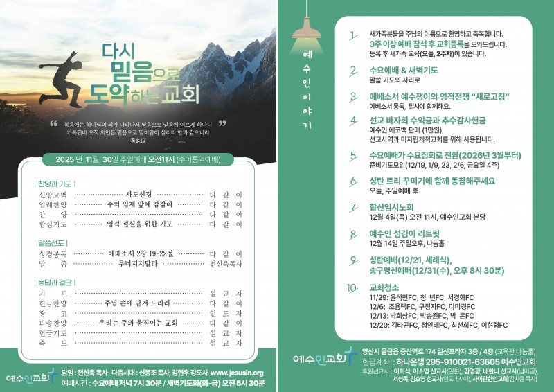 25. 11. 30. 주보 페이지 정보 작성자 예수인교회 작성일25-11-28 15:28 조회46회 댓글0건 관련링크 이전글 다음글 목록 본문 11월 마지막주일 교회 소식지입니다. 이번주일에는 예배 후 성탄장식 꾸미기 함께합니다. 댓글목록 등록된 댓글이 없습니다. 이전글 다음글 목록