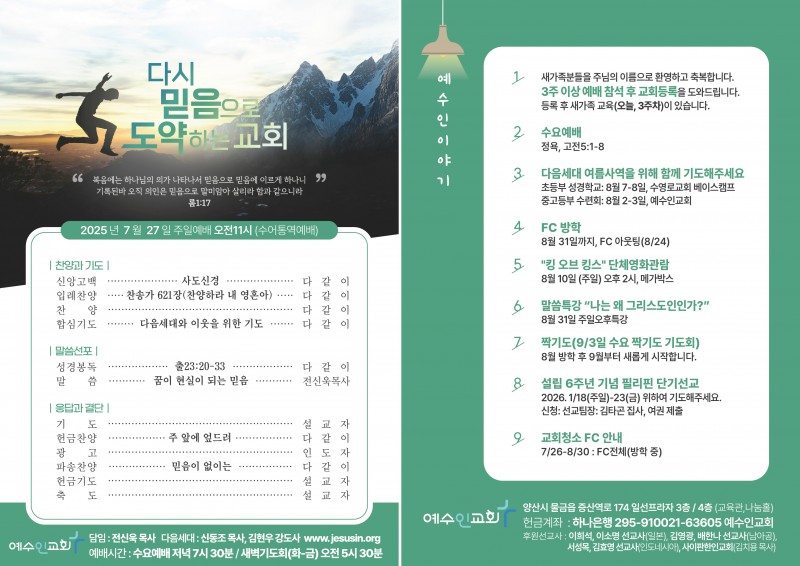25. 7. 27 주보 페이지 정보 작성자 예수인교회 작성일25-07-26 10:02 조회85회 댓글0건 관련링크 이전글 다음글 목록 본문 7월 마지막 주일 교회 소식지입니다. 이번주에는 중고등부 수련회가 있습니다. 댓글목록 등록된 댓글이 없습니다. 이전글 다음글 목록
