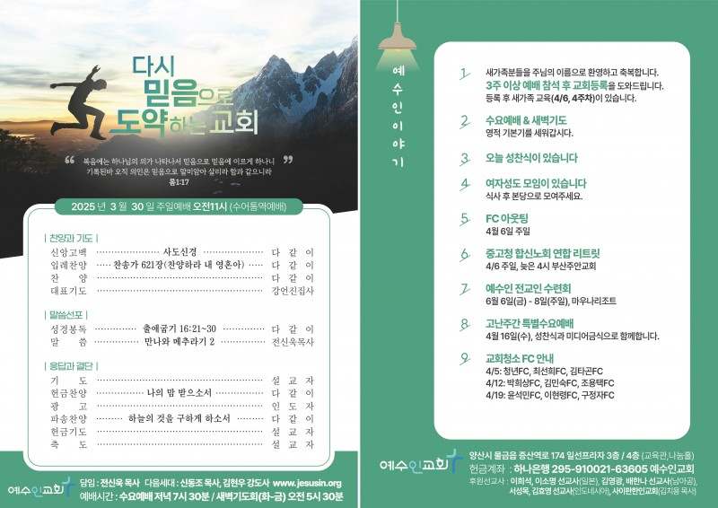 25. 3. 30 주보 페이지 정보 작성자 예수인교회 작성일25-03-28 10:15 조회75회 댓글0건 관련링크 이전글 목록 본문 3월 마지막 주일 교회 소식지입니다! 이번주에 성찬식과 여성FC 리트릿이 있습니다. 댓글목록 등록된 댓글이 없습니다. 이전글 목록