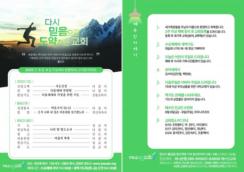 25. 5. 4. 주보 페이지 정보 작성자 예수인교회 작성일25-05-03 19:20 조회77회 댓글0건 관련링크 이전글 다음글 목록 본문 5월 첫째주일 교회소식지입니다* 어린이 주일로 드려집니다♡ 댓글목록 등록된 댓글이 없습니다. 이전글 다음글 목록