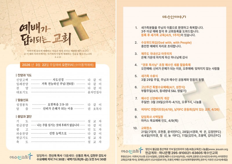 26. 3. 22. 주보 페이지 정보 작성자 예수인교회 작성일26-03-20 10:46 조회18회 댓글0건 관련링크 이전글 다음글 목록 본문 3월 넷째 주일 교회 소식지입니다. 주일 오전과 오후에 권호 목사님 초청 말씀 사경회가 있습니다. 댓글목록 등록된 댓글이 없습니다. 이전글 다음글 목록