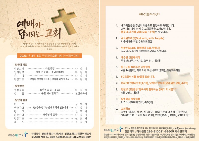 26. 4. 5 주보 페이지 정보 작성자 예수인교회 작성일26-04-03 14:25 조회4회 댓글0건 관련링크 이전글 다음글 목록 본문 4월 첫째 주일 교회 소식지입니다. 부활주일로 드려지며, S&L 동네방네 청소가 함께 이루어집니다.^^ 댓글목록 등록된 댓글이 없습니다. 이전글 다음글 목록