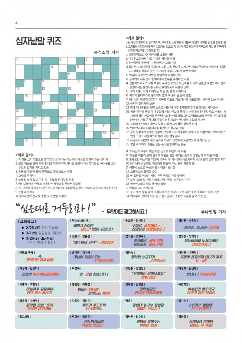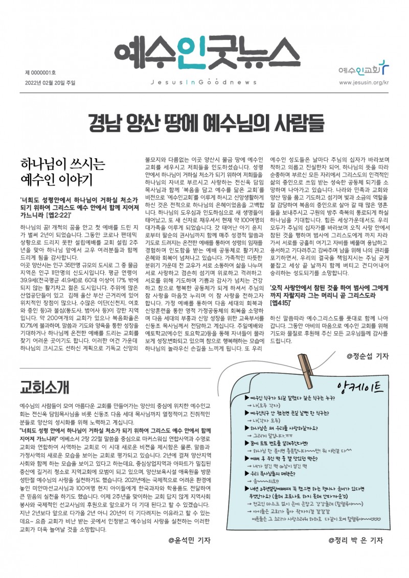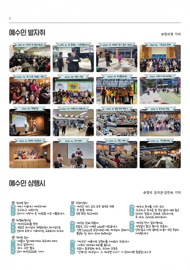 예수인굿뉴스신문(설립2주년기념) <--클릭 페이지 정보 작성자 예수인교회 작성일22-03-02 18:17 조회180회 댓글0건 관련링크 이전글 다음글 목록 본문 설립2주년감사예배를 기념하여 예수인 가족들과 함께 신문을 발행^^ 댓글목록 등록된 댓글이 없습니다. 이전글 다음글 목록