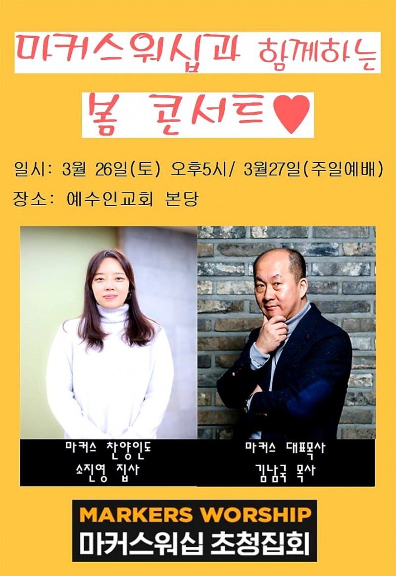 마커스워십과 함께하는 봄 콘서트 <--클릭 페이지 정보 작성자 예수인교회 작성일22-03-03 21:45 조회177회 댓글0건 관련링크 이전글 다음글 목록 본문 *첫번째 시간: 3월 26일(토) 오후 5시. 소진영 집사 찬양간증 + 김남국목사 말씀 *두번째 시간: 3월 27일(주일) 오전 주일예배시 소진영 집사 예배인도 + 김남국 목사 주일 말씀 양일간 찬양과 말씀의 은혜의 시간을 준비했습니다. 많은 기도와 참여 부탁드립니다! 댓글목록 등록된 댓글이 없습니다. 이전글 다음글 목록